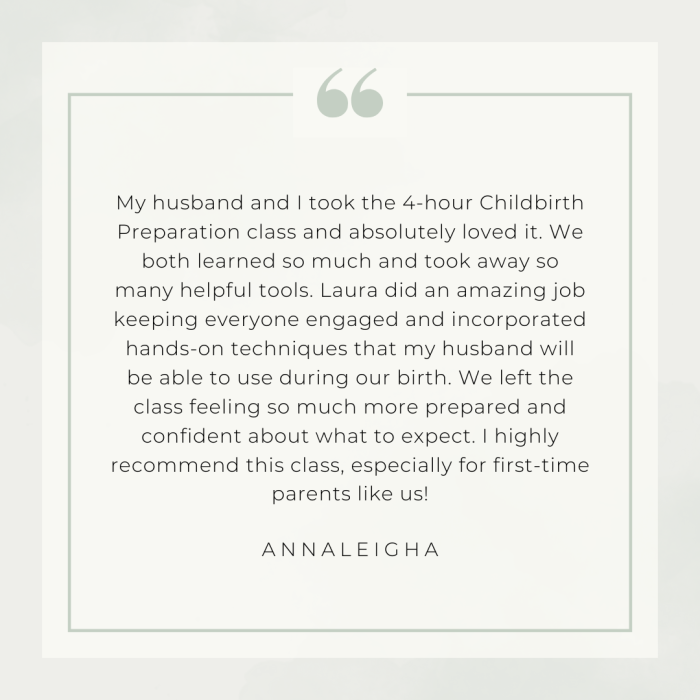 This four hour class touches on everything! It is a crash course in all things birth. You will learn the anatomy and physiology of birth, stages of labor, about informed consent, various tools for labor including natural and pharmacological options, introduction to induction, Cesarean sections and more. This is great for first time expectant parents or for those looking for a refresher course.
